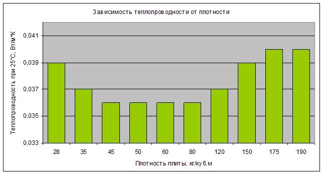 Зависимость теплопроводности базальтового утеплителя, от плотности. ( Чем ниже показатель теплопроводности, тем эффективнее утеплитель. )