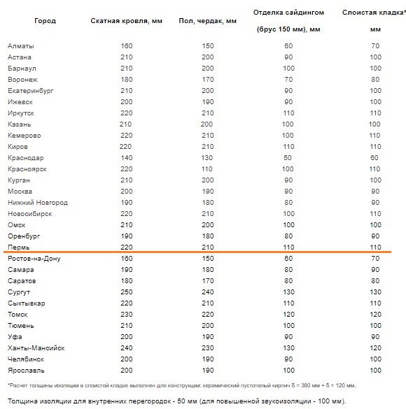 Таблица необходимой толщины утепления базальтовой ватой. (Нормативным документом при расчете толщины служит СНиП 23-02-2003 «Тепловая защита зданий».)